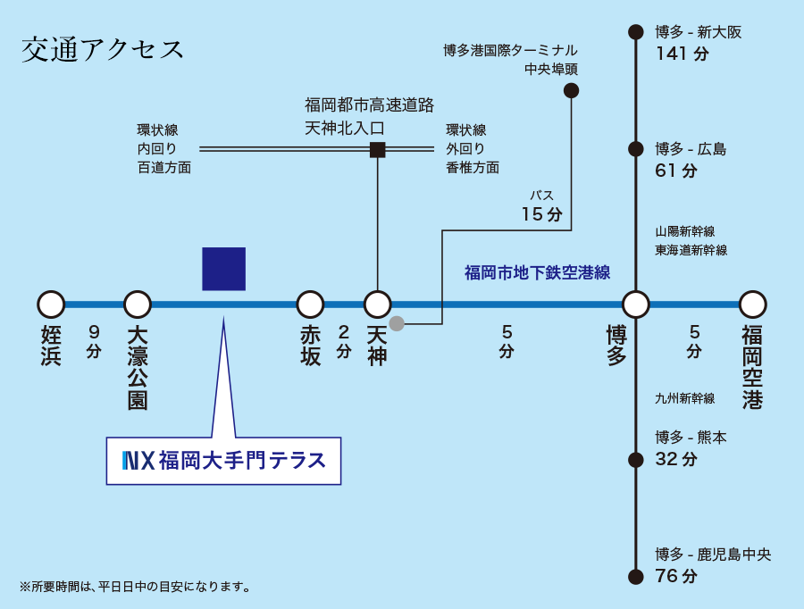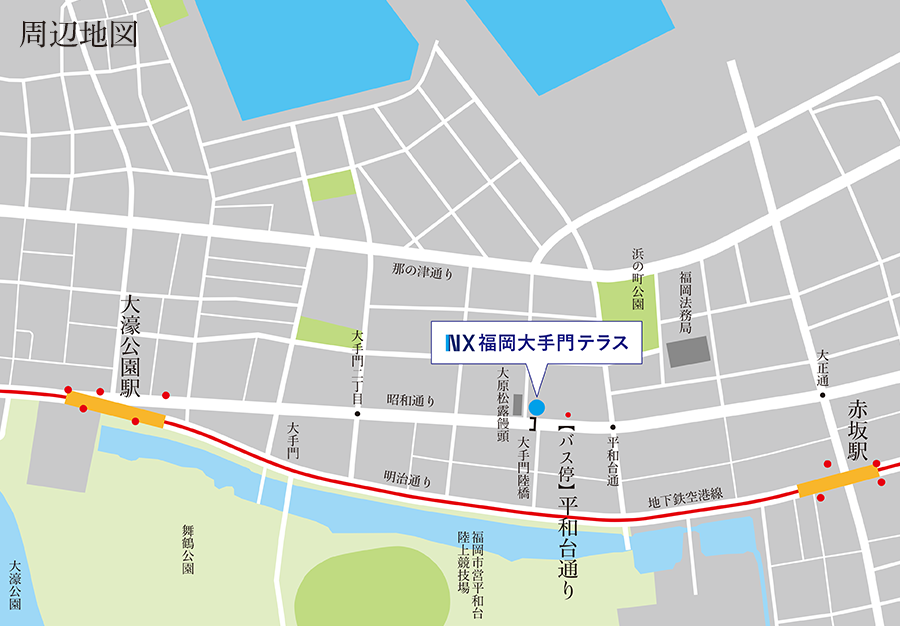 | 交通 | 地下鉄空港線「赤坂」駅徒歩8分 地下鉄空港線「大濠公園」駅徒歩8分 西鉄バス「平和台通り」徒歩30秒 |